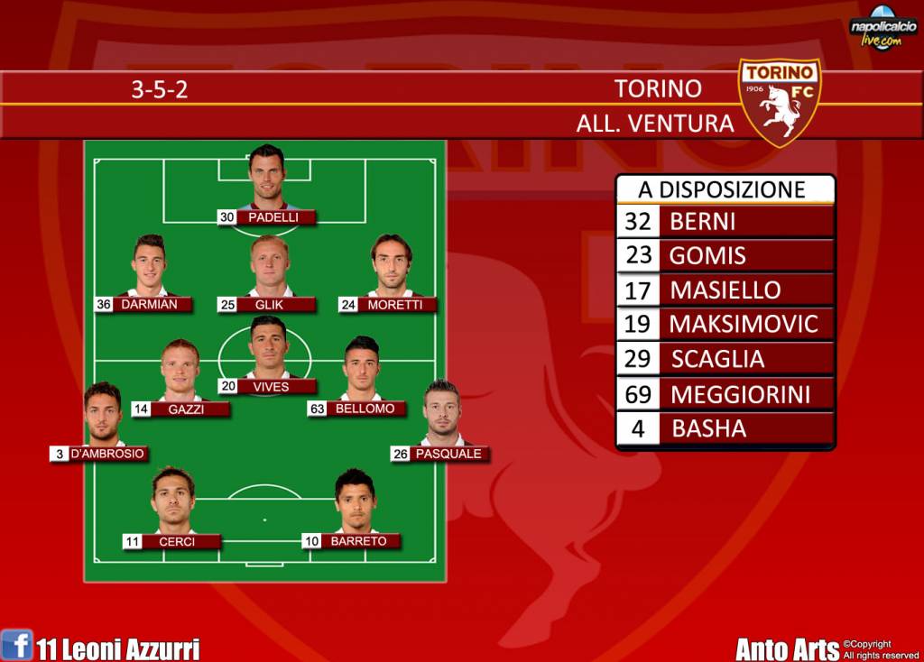 Torino: (3-5-2): Padelli; Darmian, Glik, Moretti; D’Ambrosio, Gazzi, Vives, Bellomo, Pasquale; Cerci, Barreto.