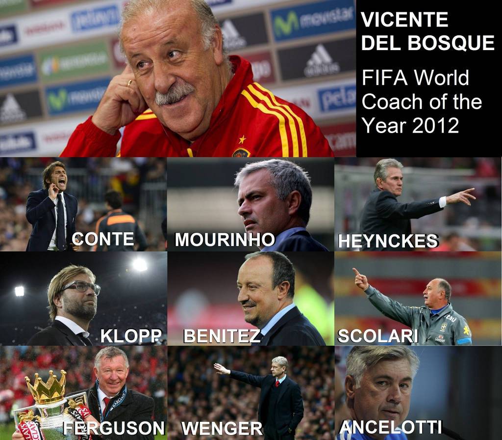 Carlo Ancelotti (Italia / Paris Saint-Germain FC / Real Madrid CF), Rafael Benítez (Spagna / Chelsea FC / SSC Napoli), Antonio Conte (Italia / Juventus), Vicente Del Bosque (Spagna / Spagna squadra nazionale), Sir Alex Ferguson (Scozia / Manchester United ex allenatore FC), Jupp Heynckes (Germania / Bayern München ex allenatore), Jürgen Klopp (Germania / Borussia Dortmund), José Mourinho (Portogallo / Real Madrid / Chelsea FC), Luiz Felipe Scolari (Brasile / Brasile nazionale), Arsène Wenger (Francia / Arsenal FC).
