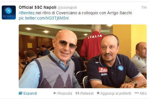 “#Benitez nel ritiro di Coverciano a colloquio con Arrigo Sacchi“. Questo il tweet apparso sul profilo del Napoli con tanto di foto che ritrae l’allenatore spagnolo seduto ad un tavolo con l’ex ct dell’Italia. Dopo il match con la Fiorentina, gli azzurri non faranno subito ritorno a Castelvolturno per un imprevisto (CLICCA QUI PER LEGGERE LA NEWS).