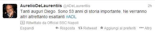 Anche Aurelio De Laurentiis si unisce al “coro” di auguri per Diego Armando Maradona. Dal proprio profilo twitter, il patron azzurro scrive: “Tanti auguri Diego. Sono 53 anni di storia importante. Ne verranno altri altrettanto esaltanti #ADL“.
