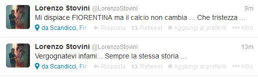 FOTO – Stovini furioso per il rigore: “Vergognatevi, infami!” 30/10/2013 di Antonio Papa Non è stato accolta con favore da Lorenzo Stovini la decisione del signor Calvarese di non concere alla Fiorentina un calcio di rigore su Cuadrado: l’ex Empoli, notoriamente tifoso viola, ha così commentato sul suo profilo Twitter: