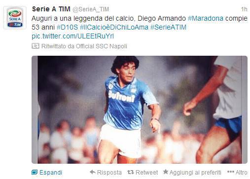 FOTO – Tweet ‘Serie A Tim’ per Maradona, ecco il messaggio 15/03/201630/10/2013 di antoizzo Arrivano anche gli auguri dal profilo twitter della ‘Serie A Tim’ per Diego Armando Maradona. Dal social network si legge: “Auguri a una leggenda del calcio, Diego Armando #Maradona compie 53 anni #D10S” Ecco lo screen shot A.I.