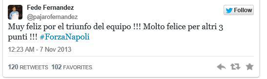 FOTO – Fernández: “Molto felice per altri tre punti! Forza Napoli!” 07/11/2013 di Antonio Papa A seguire, il commento pubblicato dal difensore azzurro sul suo profilo Twitter: