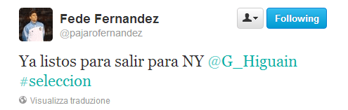 “Ya listos para salir para NY @G_Higuain” ovvero “Pronti per andare a New York“. Questo il tweet di Federico Fernandez, che insieme ad Higuaìn disputerà due amichevoli con la sua Argentina negli States: contro Ecuador (il 15 novembre a East Rutherford, alla periferia di New York) e Bosnia (il 18 Saint Louis, nel Missouri).