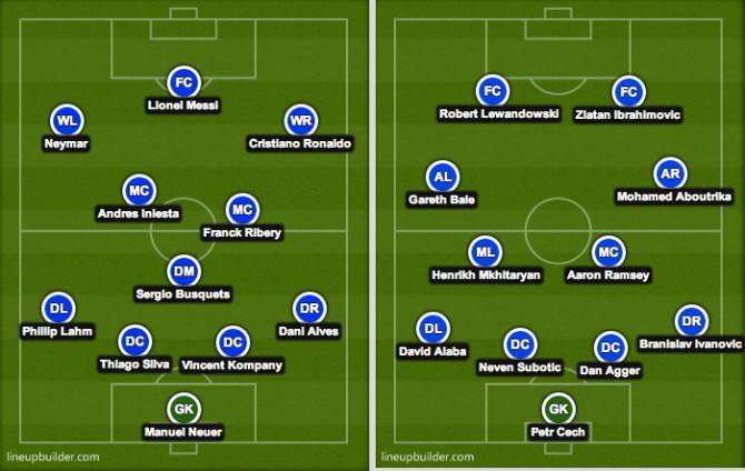 Sono due top 11 da sogno quelle che vedono di fronte la squadra dei migliori calciatori che vedremo in Brasile il prossimo giugno e quelli che, purtroppo, assisteranno ai Mondiali come semplici spettatori. Nella top 11 di chi andrà ai Mondiali abbiamo Neuer in porta; Kompany, Thiago Silva, Dani Alves e Lahm in difesa. Busquets davanti alla difesa. Ribery e Iniesta sulla trequarti. Cristiano Ronaldo, Messi e Naymar in attacco. Dall’altra parte abbiamo Cech in porta. Agger, Sobotic, Ivanovic e Alaba in difesa. Ramsey e Mkhltaryan a centrocampo. Aboutrika e Bale sulle fasce. Ibrahimovic e Lewandowski in attacco. Chi avrebbe vinto?