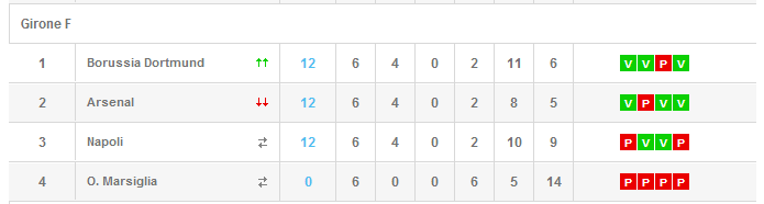 Napoli fuori dalla Champions nonostante quota 12. Riesce quasi l’impresa ai ragazzi di Benitez a cui manca un solo gol per fare fuori l’Arsenal e passare il turno. E invece anche il Borussia chiude a quota 12 e vince addirittura il girone, relegando gli azzurri al terzo posto e dunque all’Europa League. E’ la prima volta nella storia della Champions che con un tale punteggio non ci si qualifica