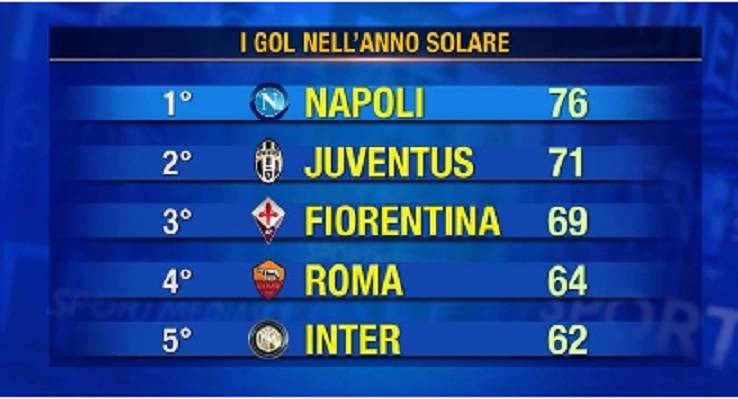 FOTO – Ecco le cinque squadre che hanno segnato di più nel 2013: il Napoli stacca la Juve! 15/03/201624/12/2013 di vincenzomatino Concluso il 2013 calcistico è tempo di bilanci. Vi proponiamo la classifica delle 5 squadre che hanno segnato più gol fornita da Sportmediaset.it. HAI TWITTER? AMI IL NAPOLI? CLICCA QUI PER SEGUIRE IL TUO NAPOLI SU TWITTER
