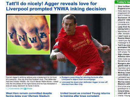 C’è un particolare legame tra Daniel Agger e i tifosi del Liverpool. Un anno fa il difensore danese dimostrò tutto il suo amore per la tifoseria con un singolare tatuaggio. Sul dorso delle dita si fece incidere le iniziali ‘YNWA‘, acronimo di ‘You’ll never walk alone’, storico inno del popolo ‘red’. All’epoca Agger disse: “Mi sento parte di questo club, di questa città. La decisione è stata facile: sono fiero di essere qui, e le mie nocche lo dimostrano“. Il gesto di Agger ha fatto praticamente impazzire la tifoseria, al punto che adesso nessuno vuole che il Liverpool lo ceda. Un sondaggio parla chiaro: Daniel Agger non si tocca (CLICCA QUI PER LEGGERE IL SONDAGGIO). Adesso parola al mercato e al diretto interessato!