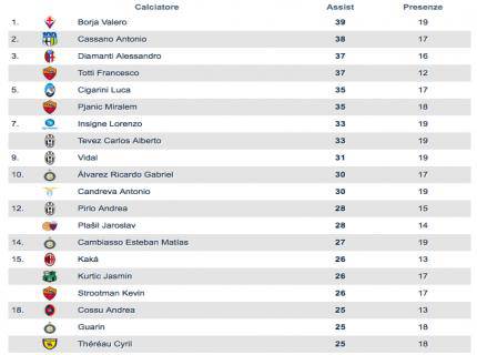 Borja Valero è campione d’inverno. Il centrocampista della Fiorentina si impone nella speciale classifica degli assist-man al termine del girone d’andata con 39 suggerimenti. Sul podio seguono Cassano e il duo formato da Diamanti e Totti. Il capitano della Roma ha però collezionato solo 12 presenze in campionato. In classifica anche un azzurro: Lorenzo Insigne che, nonostante il “problema del gol” risolto solo domenica, risulta l’azzurro che sforna più assist: ben 33 in 19 presenze.