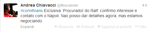 L’agente di Ralf, centrocampista del Corinthians nel mirino anche del Napoli, fa sapere dell’esistenza di una trattativa con gli azzurri. E’ quanto riporta un tweet di Andrea Chiavacci, corrispondente in Brasile di ‘Fox Sport’