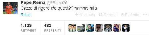 “Ca**o di rigore è questo? Mamma mía”. Il commento di Pepe Reina su twitter arriva proprio nel momento in cui Mazzoleni fischia un rigore dubbio per la Roma contro il Verona.