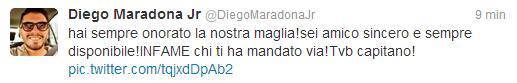 Tanti messaggi per Paolo Cannavaro. Il capitano di mille battaglie lascia il Napoli dopo anni di soddisfazioni e vittorie memorabili. Ecco il messaggio di Diego Armando Maradona jr su Twitter: “Hai sempre onorato la nostra maglia! Sei amico sincero e sempre disponibile! INFAME chi ti ha mandato via! Tvb capitano!”.
