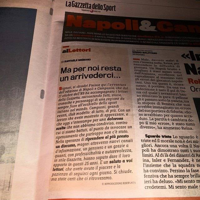 Chiude, dopo 25 anni di onorata carriera, la Gazzetta dello Sport, edizione Napoli & Campania, con la redazione campana che da domani non sarà più in edicola insieme con il quotidiano base.