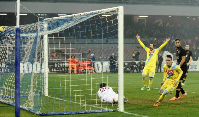Il Napoli stravince contro la Roma e va in finale di Coppa Italia. Serata perfetta al San Paolo, iniziata con il gol di Callejon, proseguita con l’arrivo di Maradona allo stadio e conclusasi con le reti di Higuain e Jorginho. Adesso in finale il Napoli affronterà la Fiorentina.