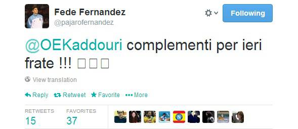 El Kaddouri va in gol col Torino. Ecco i complimenti di Fernandez 18/02/2014 di Gennaro Arpaia Dopo il gol del 3-1 ce ha permesso al suo Torino di espugnare Verona, Omar El Kaddouri ha ricevuto via Twitter auguri molto speciali da parte di Federico Fernandez. Il difensore azzurro ha così twittato: “Complementi per ieri frate !!!” G.A.