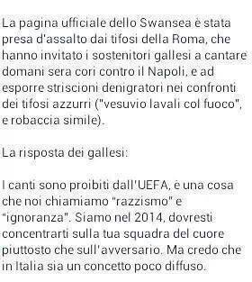 Alla richiesta vergognosa dei tifosi della Roma (Clicca qui per leggere la news) i tifosi dello Swansea hanno risposto con una semplicità e una civiltà che purtroppo in Italia è più unica che rara. Ecco la risposta dei tifosi gallesi: