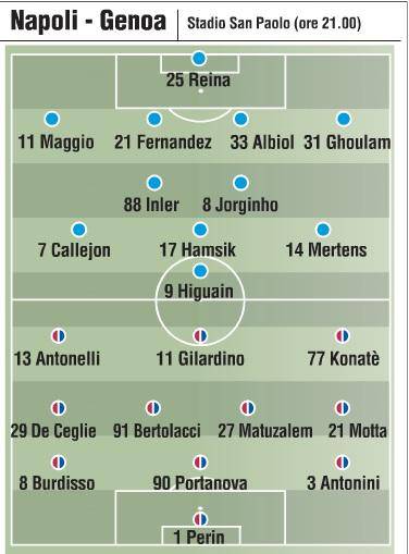 Questa sera il Napoli affronterà al San Paolo il Genoa di Gasperini. Rafa Benitez si affiderà ai suoi fedelissimi, riportando al centro della difesa Albiol, a centrocampo Inler e in attacco Callejon. Tra i pali ci sarà Reina, titolare ancor più inamovibile dopo il brutto infortunio di Rafael. La linea mediana sarà invece completata dal rientrante Jorginho che tanto bene ha fatto sino ad ora. L’edizione odierna del ‘Mattino’ ha provato a costruire un grafico con i possibili schieramenti delle due squadre: