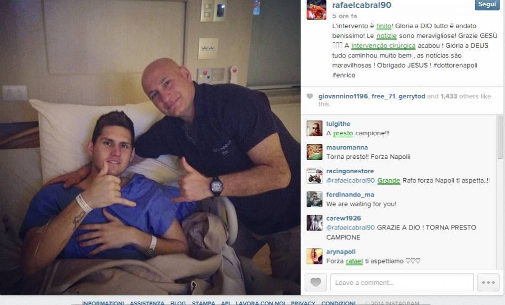 “L’intervento è finito! Gloria a DIO tutto è andato benissimo! Le notizie sono meravigliose! Grazie GESÙ”, questo il breve ma intenso messaggio di Rafael, portiere del Napoli infortunatosi al crociato, subito dopo l’operazione effettuata in Brasile.