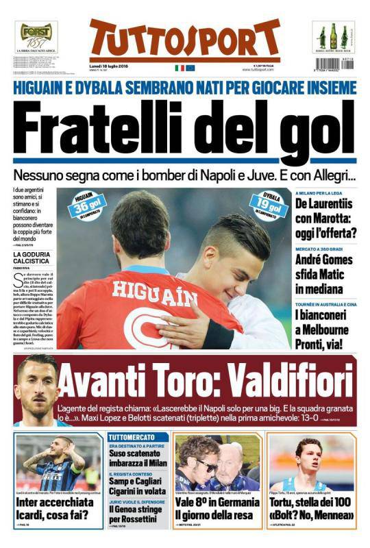 TUTTOSPORT – Il titolo principale del giornale torinese è “Fratelli del gol”. “Higuain e Dybala sembrano nati per giocare insieme. Nessuno segna come i bomber di Napoli e Juve. E con Allegri…”. Inoltre “I due argentini sono amici, si stimano e si confidano: in bianconero possono diventare la coppia più forte del mondo”. Oggi a Milano incontro nella sede della Lega: “De Laurentiis con Marotta: oggi l’offerta”. In taglio basso si parla del possibile approdo di Mirko Valdifiori al Torino: “Avanti Toro: Valdifiori. L’agente del regista chiama: “Lascerebbe il Napoli solo per una big. E la squadra granata lo è”.