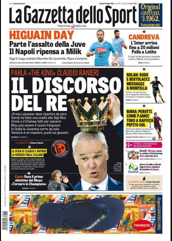 GAZZETTA DELLO SPORT – I titoli principali della ‘Rosea’: “Higuain day. Parte l’assalto della Juve. Il Napoli ripensa a Milik. Oggi in Lega contatto Marotta-De Laurentiis”. A lato l’offerta dell’Inter alla Lazio per Antonio Candreva: “L’Inter arriva fino a 20 milioni. Palla a Lotito. C’è già l’ok del giocatore: possibile vertice a Milano con il presidente”.