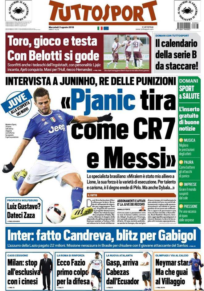 TUTTOSPORT – Juventus in primo piano: “Pjanic tira come CR7 e Messi”. In alto il Torino, il calendadio di Serie B, a destra varie notizie, in basso l’Inter vicinissima a Candreva e Gabigol e poi varie di Serie A ed altro.