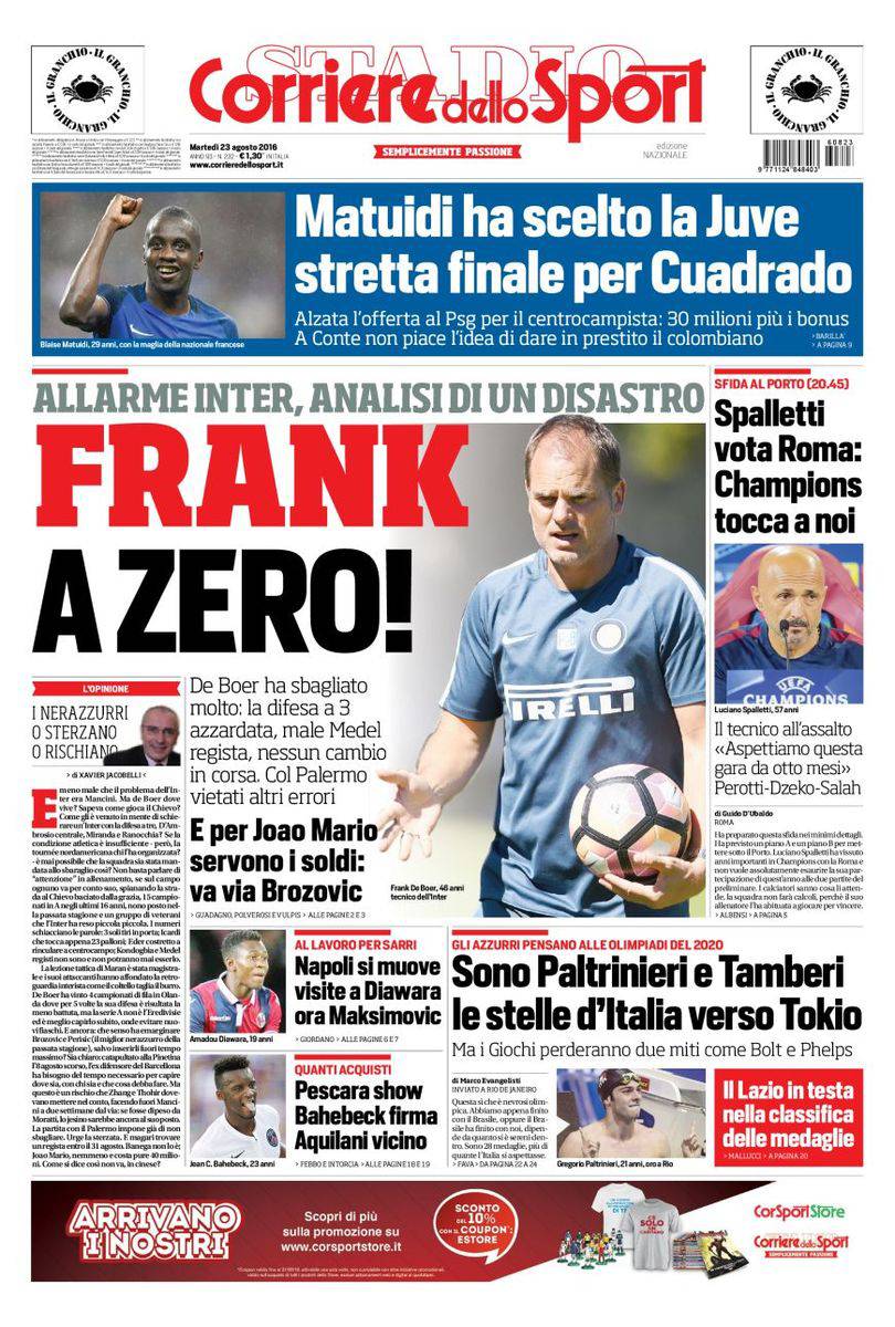 ‘La Gazzetta dello Sport’ dedica la prima alle due milanesi. Shevchenko vota Bacca partito subito con una tripletta nella vittoria del Milan contro il Torino. La Rosa analizza la sconfitta dell’Inter in casa del Chievo: quattro mosse fondamentali per ripartire. Spazio anche per la Roma pronta ad affrontare il Porto per il ritorno dei preliminari di Champions League, Spalletti suona la carica: “Chi teme il Porto non è da Roma”. Anche ‘Il Corriere dello Sport’ lancia l’allarme per i neroazzurri, mentre sul fronte calciomercato Matuidi sceglie la Juventus ed il Napoli è pronta ad ufficializzare Diawara e puntare tutto su Maksimovic del Torino. Anche il Pescara si muove e dopo Bahebeck, è pronto ad accogliere Aquilani. ‘Tuttosport’ invece dedica ampio spazio all’arrivo di Cuadrado alla Juventus e al pressing per Matuidi. Nel frattempo il Torino sta per acquistare l’ex portiere azzurro Gabriel.