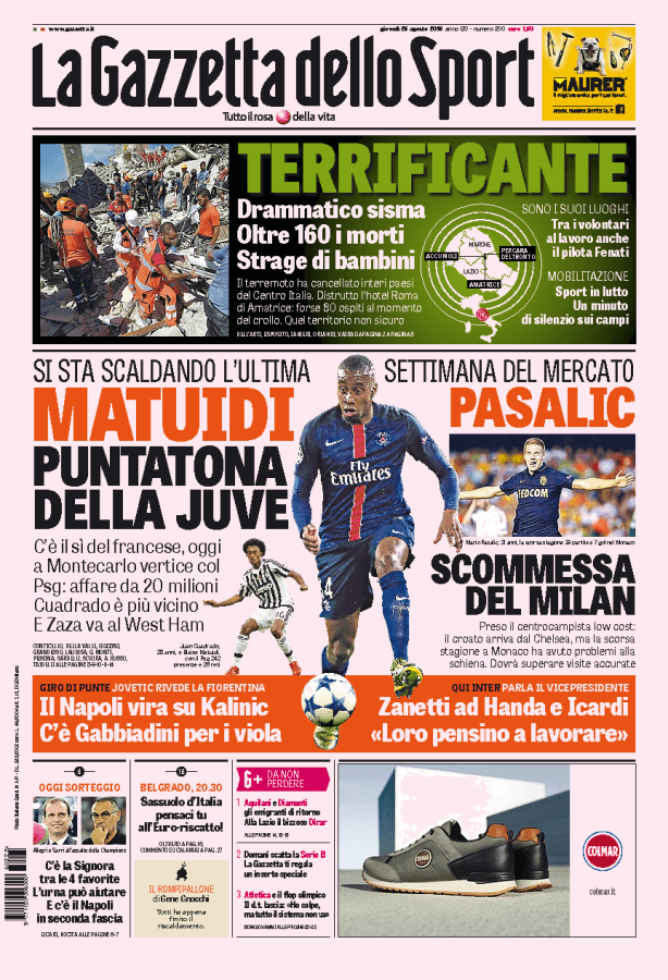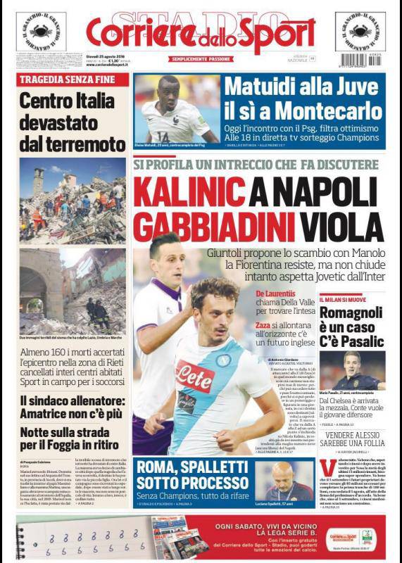 CORRIERE DELLO SPORT – Il titolo di apertura è “Kalinic a Napoli, Gabbiadini viol”. Si profila un intreccio che fa discutere”. Giuntoli propone lo scambio con Manolo, la Fiorentina restiste ma non chiude, intanto aspetta Jovetic dall’Inter. A destra: “Romagnolo è un caso, c’è Pasalic”, le manovre di mercato in casa Milan. In alto: “Matuidi alla Juve, il si a Montecarlo”. Oggi l’incontro con il PSG, filtra ottimismo. Alle 18 in diretta tv sorteggio Champions. A sinistra extra sport: si parla del terremoto che ha devastato l’Italia centrale. In basso “Roma, Spalletti sotto processo”. Il tecnico giallorosso sul banco degli imputati dopo il 3-0 incassato nei preliminari di Champions League.