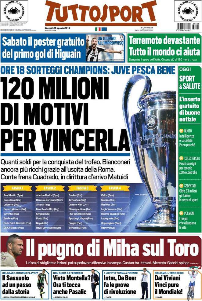 TUTTOSPORT – Il giornale torinese apre con la Champions League ed il sorteggio dei gironi di oggi pomeriggio: “120 milioni di motivo per vincerla”, con una foto della coppa ed un approfondimento dei soldi garantiti dalla competizione. In basso notizie sul Torino e varie di Serie A, in alto ancora Juve e poi il terremoto dell’Italia centrale.