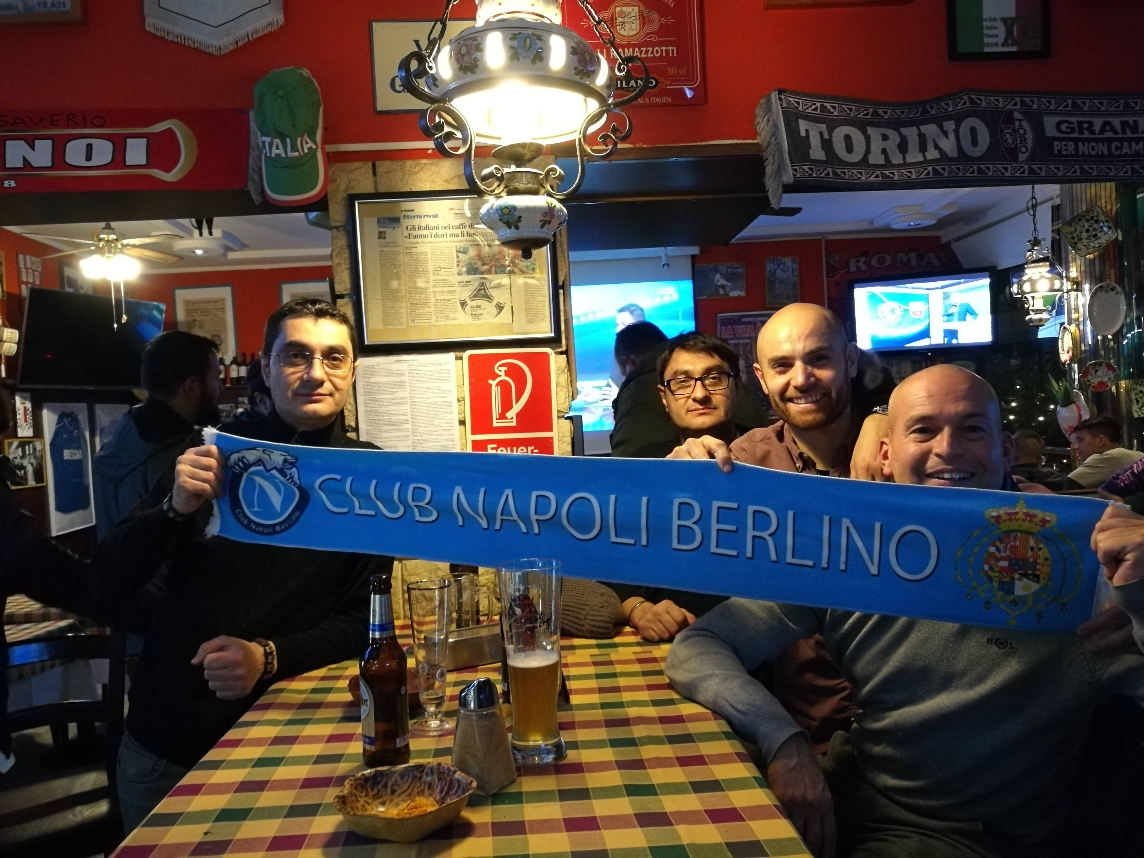 Il Club Napoli Berlino non è un club come gli altri. Club ufficiale ed unico presente a Berlino a prima vista sembra più un gruppo di amici che si incontra al bar per parlare di calcio e, ovviamente, per guardare il Napoli. Per Napolicalciolive.com stiamo seguendo la trasferta del Napoli a Lipsia, con immancabile scalo a Berlino. Qui abbiamo preso contatti con uno degli esponenti principali di questo gruppo: si chiama Vincenzo, è a Berlino da 8 anni per studio e per amore. Nel frattempo ha avuto numerose esperienze lavorative all’Hard Rock Cafè, Easyjet, Zalando ed ora FlixBus. A Berlino ha la possibilità di allenarsi e guadagnare per riuscire a fare quello che più gli piace…cioè correre. È un maratoneta e coltiva il sogno di partecipare alla maratona di New York. Vincenzo ci dà appuntamento al quartier generale del Club. Arriviamo a Wittembergplatz e ci mettiamo trenta secondi per trovarlo. Inconfondibile. Caffè Bistrot Italia. Sembra esattamente quello che è: un localino a tema rigorosamente calcistico dove sorseggiare l’immancabile birra e guardare le partite insieme ad una clientela prevalentemente italiana. Anzi, prevalentemente napoletana. Il cameriere, pensate, è di Dimaro: “Quando ci ha detto di dov’era – racconta Francesco, a Berlino già da qualche lustro – ha aggiunto che era un paesino minuscolo in Trentino che non avremmo mai potuto conoscere. Quando ha detto ‘Dimaro’ siamo esplosi in un boato. Non sapeva che ormai a casa sua tifano tutti Napoli. Ora, naturalmente, tifa Napoli anche lui”. E visto l’ambiente non potrebbe essere altrimenti.