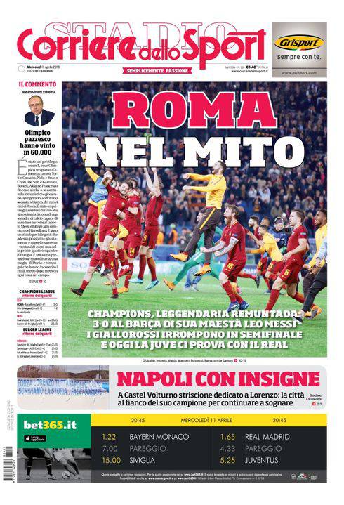 Il Corriere dello Sport mette in primo piano, come è giusto che sia, la Roma. I giallorossi di eusebio Di Francesco riescono a centrare l’impresa eliminando il Barcellona e sovvertendo il pronostico sfavorevole, alla luce del 4-1 al passivo incassato all’andata. Dzeko subito in apertura, un rigore di De Rossi al quarto d’ora della ripresa ed un gol di Manolas all’82’ mandano la Roma in semifinale, dove c’è già il Liverpool, che ha sconfitto per 2-1 il Manchester City dopo il 3-0 in proprio favore dell’andata. Si parla anche di Napoli e di Lorenzo Insigne: a Castel Volturno spunta uno striscione dedicato a lui, l’incomprensione di domenica comunque era già stata superata.