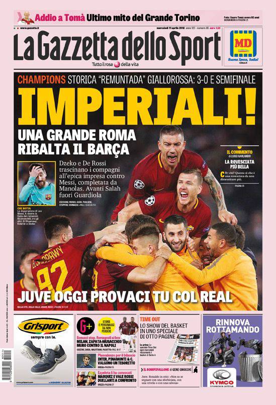 Gazzetta dello Sport: anche qui la prima pagina è tutta per la Roma e, se vogliamo, per il calcio italiano, che finalmente è riuscito a prevalere su quello spagnolo dopo il comunque precedente recente della Juventus col Barcellona della scorsa stagione. Ma i bianconeri sono chiamati a loro volta a fare l’impresa in casa del Real Madrid, in seguito al 3-0 al passivo della gara di andata. Completano la prima pagina altre notizie di vari sport e di calcio, tra le quali i guai in difesa del Milan. Contro il Napoli, i rossoneri si affideranno nel reparto arretrato all’inedito duo Zapata-Musacchio.