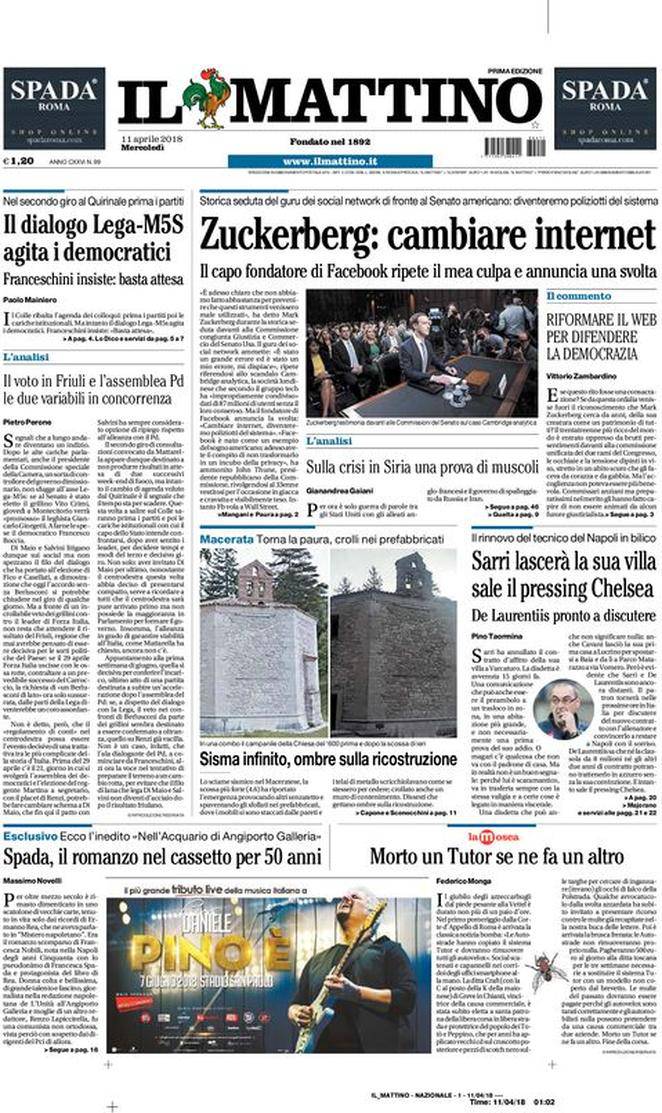 Il Mattino: il giornale di Napoli presenta varie notizie di cronaca, politica ed attualità. Al centro dell’attenzione lo scandalo Facebook e l’ammissione di colpa del suo fondatore e CEO, Mark Zuckenberg. Per quanto riguarda il calcio, c’è una notizia sul Napoli che riguarda Maurizio Sarri. L’allenatore azzurro avrebbe dismesso l’affitto della sua villa a Varcaturo, e per Il Mattino questo è l’indizio su un possibile addio al club di De Laurentiis.