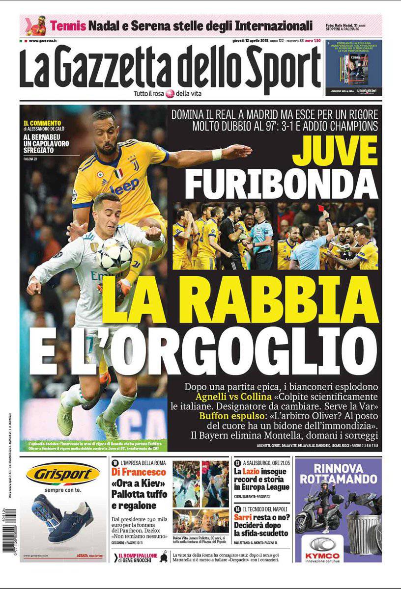 “Concedere al 93′ un rigore discutibile che decide l’accesso alla semifinale della Champions a livello arbitrale è un errore. Lo spagnolo prova il controllo di petto sulla torre di Ronaldo, da dietro arriva Benatia. Tra l’altro, Oliver, inglese di 33 anni, ha dimostrato di non essere all’altezza della sfida: ha fischiato molto, ammonito altrettanto”, è questa invece la moviola della Gazzetta dello Sport che accusa la direzione di gara dell’arbitro inglese Oliver. Per quanto riguarda il futuro di Maurizio Sarri la Gazzetta scrive: “Deciderà dopo la sfida-scudetto”.