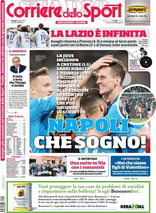 Corriere dello Sport – “Napoli, che sogno!”. Apre così in prima pagina l’edizione odierna de ‘Il Corriere dello Sport’, che esalta dunque la vittoria degli azzurri di Sarri, ritornati in piena corsa scudetto ad una manciata di giorni dallo scontro diretto con la Juventus. La prima pagina prosegue poi nel dettaglio: “La Juve inciampa a Crotone. Sarri ribalta l’Udinese e accorcia a meno 4. Domenica allo Stadium lo scontro diretto che può decidere lo scudetto”. In taglio alto anche le romane con i successi ricchi di goal di Lazio e Roma, rispettivamente contro Fiorentina e Genoa.