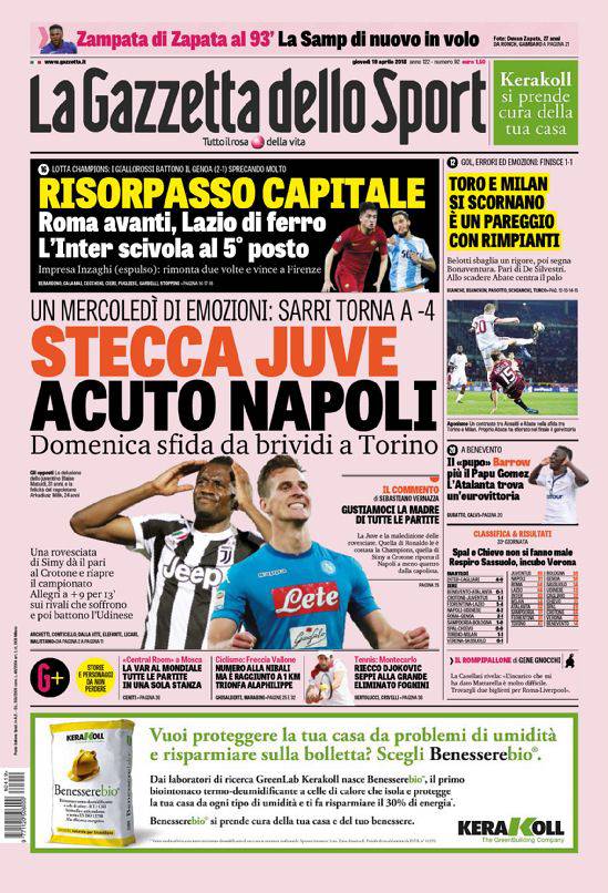 La Gazzetta dello Sport – Primissima pagina tutta dedicata al duello a distanza tra Juventus e Napoli per lo scudetto anche sulla rosea che titola: “Stecca Juve, acuto Napoli. Un mercoledì di emozioni: Sarri torna a -4. Domenica sfida da brividi a Torino”. Tanta attenzione quindi per il pari della Juve e per la vittoria in rimonta del Napoli con l’Udinese, con la Gazzetta che evidenzia la rovesciata di Simy che è costata due punti alla truppa di Allegri. In spalla il pari per 1-1 tra Torino e Milan, mentre in taglio alto trova spazio il ‘risorpasso capitale’ da parte delle due romane nei confronti dell’Inter nell’accesa corsa alle posizioni che valgono la Champions League.