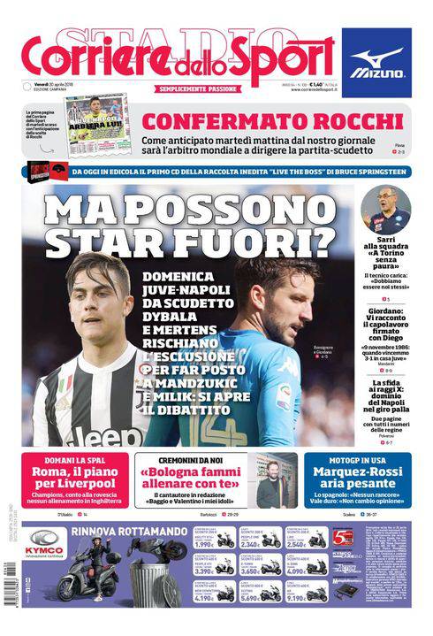 Il Corriere dello Sport – Il quotidiano romano dedica già la sua prima pagina a Juventus-Napoli, la sfida scudetto che si giocherà domenica sera. E che rischia di non avere – almeno dall’inizio – due grandissimi protagonisti. Si tratta di Paulo Dybala e Dries Mertens, entrambi reduci da un periodo di appannamento. Nel caso dello juventino c’è da fare anche i conti con le critiche dei tifosi, dopo la prova in casa del Crotone che ha suscitato le ire di tanti supporters. A dirigere l’incontro sarà l’abitro Rocchi di Firenze. A lato tante news inerenti la grande ed attesissima sfida. In basso altre di calcio e vari sport.