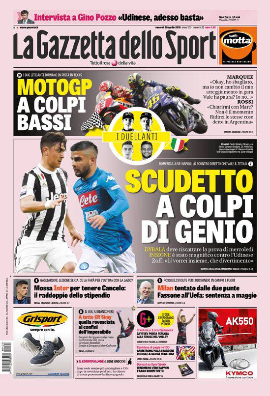 La Gazzetta dello Sport – Anche qui domina Juventus-Napoli nella prima pagina. “Scudetto a colpi di genio”, titola la Rosea, in riferimento alla classe di Dybala e di Lorenzo Insigne. In alto c’è la MotoGP con il duello tra Valentino Rossi e Marc Marquez. In basso altre di calcio, con le milanesi in particolare, ed altri sport.