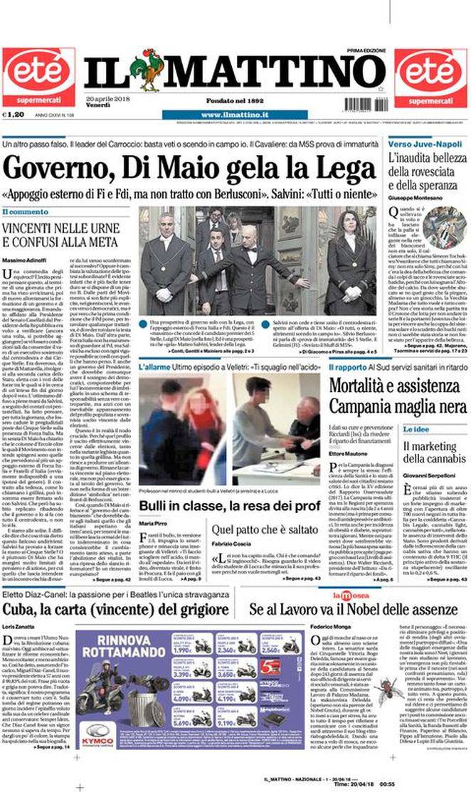 Il Mattino – Qui il calcio è in secondo piano e lascia spazio a notizie di politica e cronaca in prevalenza. Per quanto riguarda il Napoli c’è però un editoriale in alto, proprio in direzione dello scontro scudetto che si spera possa arridere agli azzurri.