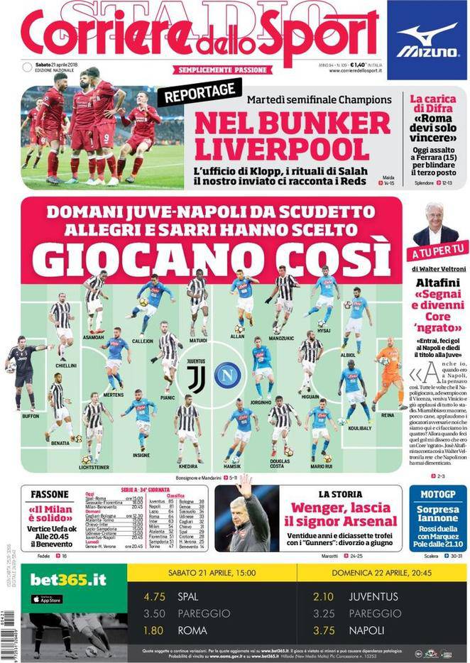 Il Corriere dello Sport – Il quotidiano romano dedica gran parte della sua prima pagina a Juventus-Napoli, sfida scudetto che si giocherà domenica sera. L’edizione odierna del Corriere dello Sport propone in prima pagina quibdu i 22 calciatori che, domani a Torino, si daranno battaglia allo Stadium nella lotta scudetto. Per il quotidiano, Napoli in campo con i titolarissimi, Juve con uno speculare 4-3-3: “Giocano così: Allegri e Sarri hanno scelto”. In taglio alto viene invece messo in evidenza un bel reportage fatto in casa Liverpool in virtù delle prossime gare di Champions della Roma.