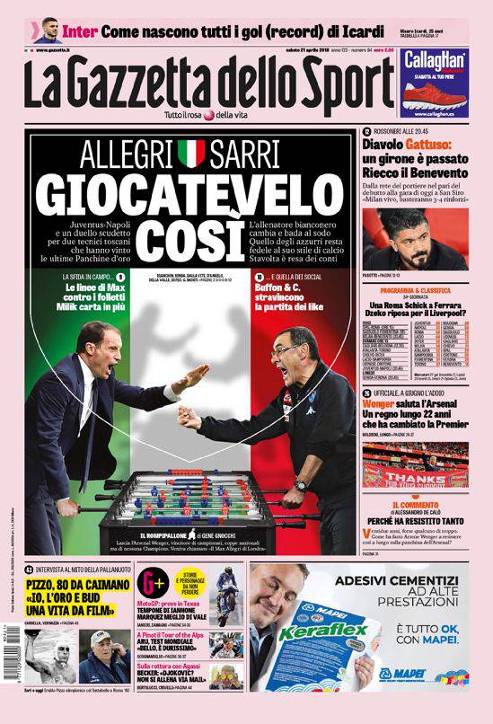 La Gazzetta dello Sport – “Allegri vs Sarri, giocatevelo così. Sfida scudetto per due tecnici toscani che hanno vinto le ultime Panchine d’Oro” si legge in prima pagina sull’edizione odierna de La Gazzetta dello Sport ad un giorno dalla super sfida tra Juve e Napoli. La rosea evidenzia come l’allenatore bianconero potrebbe cambiare e bada al sodo, mentre quello azzurro dovrebbe affidarsi ancora una volta a quelli che sono gli undici fedelissimi. Per quanto riguarda i social invece: “Buffon &c. stravincono la partita dei like”, come evidenziato dalla Gazzetta dello Sport.
