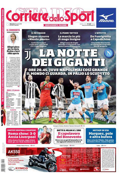 Corriere dello Sport – Per il quotidiano romano quella di oggi sarà “La Notte dei Giganti”. Va in scena all’Allianz Stadium lo scontro diretto per lo scudetto, Juve-Napoli, Chi vince compierà un passo significativo, e probabilmente decisivo, verso quella che sarà l’assegnazione del tricolore. Tutto il mondo sarà sintonizzato in televisione per godersi questa grande partita. Da parte del Napoli, si è atterrati a Torino senza paura e con un Insigne più motivato che mai. In basso, Benevento batte Milan 1-0 a San Siro, Roma ok con la SPAL in Emilia dopo un secco 3-0, poi chiude la MotoGp.