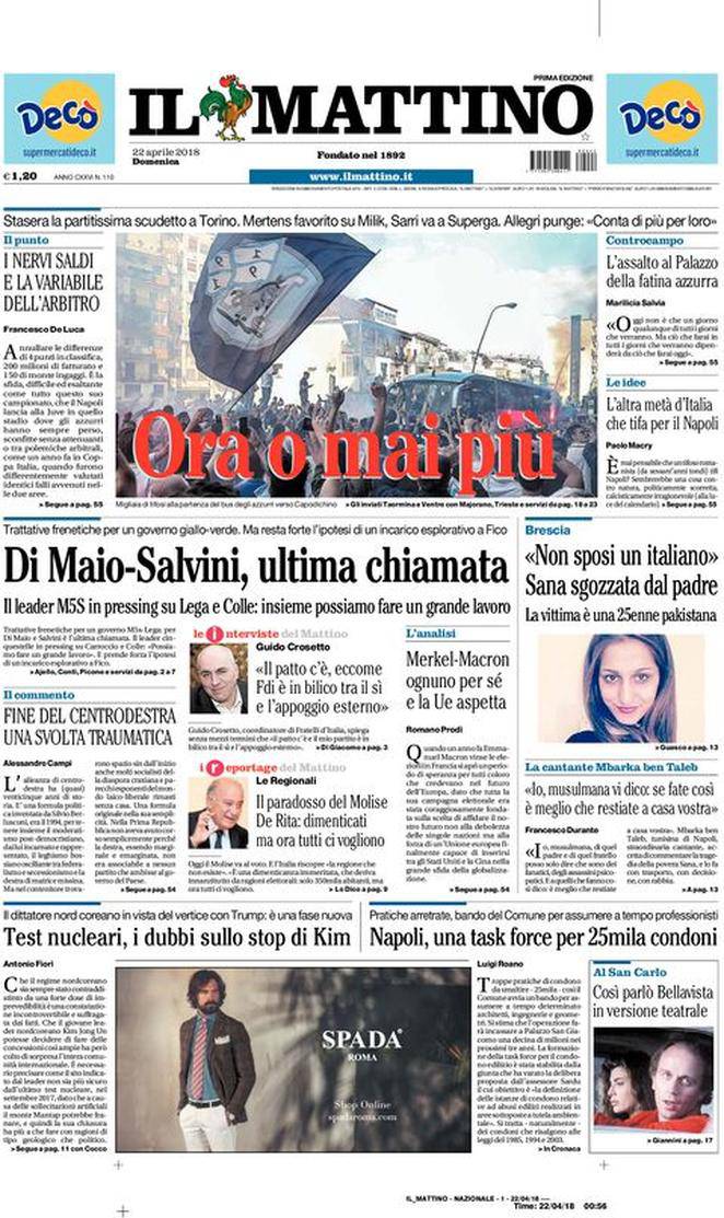 Il Mattino – La sfida Juve-Napoli occupa lo spazio principale sul giornale napoletano. “Ora o mai più” è il titolo assai esemplificativo. Con la foto dei tremila tifosi che hanno accompagnato gli uomini di Sarri per le strade della città, passando prima davanti al ‘San Paolo’ per poi arrivare alla meta finale di Capodichino, da dove la squadra è decollata alla volta di Torino. Seguono altre di cronaca e politica.