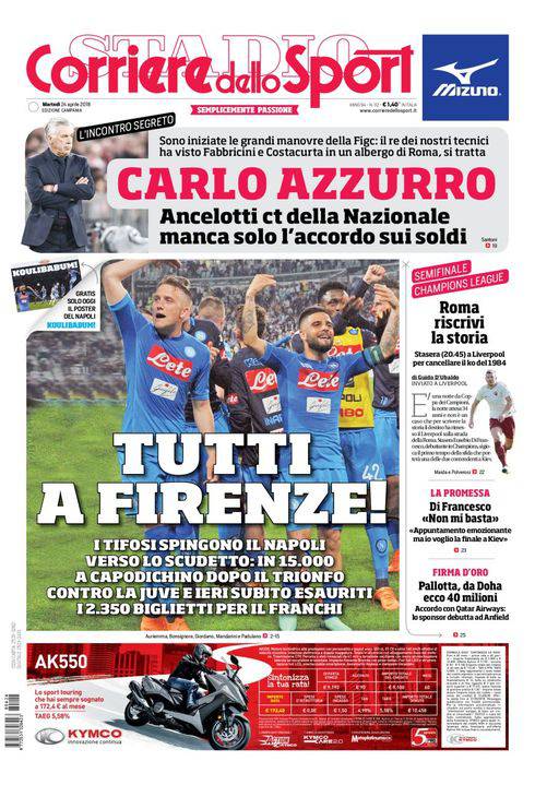 Corriere dello Sport – Il giornale romano non poteva che concedere primo piano proprio alla squadra giallorossa. In alto si parla dell’idea della Nazionale di affidare il ruolo di commissario tecnico a Carlo Ancelotti. Il solo scoglio sarebbe rappresentato dall’elevato ingaggio dell’ex allenatore del Bayern Monaco. A destra, invasione di tifosi del Napoli a Firenze domenica prossima, ma Allegri predica calma e ricorda che la Juventus è ancora al primo posto in classifica. Chiudono altre di calcio e vari sport.
