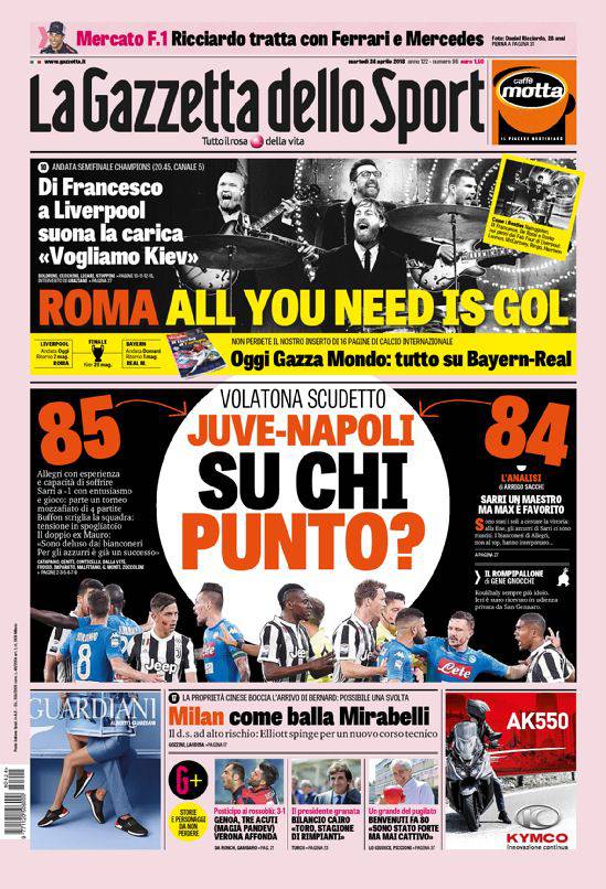 Gazzetta dello Sport – La ‘Rosea’ si interroga su come finirà la lotta scudetto. Chi la spunterà tra Juventus e Napoli? In alto in prima la Roma è chiamata all’impresa. Fotomontaggio in stile Beatles per i giallorossi di Di Francesco, che giocano stasera a Liverpool contro i Reds per l’andata delle semifinali di Champions League. Chiudono altre di calcio e vari sport.
