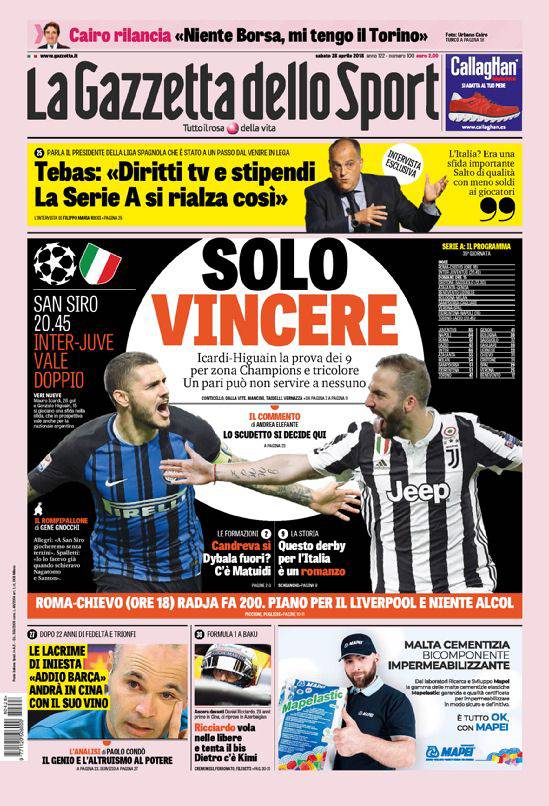 La Gazzetta dello Sport – Il quotidiano milanese dedica la sua apertura – e non potrebbe essere altrimenti – ad Inter-Juventus che si giocherà questa sera a San Siro. La partita ha dei significati importanti per entrambe le squadre dal lato sportivo. Ma anche la rivalità che da sempre divide entrambe le tifoserie, ed anche le rispettive dirigenze, farà la sua parte in quello che sarà il risultato finale. Per la Gazzetta il match “vale doppio”, ed il Napoli tifa Inter ovviamente. In alto si parla di diritti tv della Serie A. In basso, l’addio di Iniesta al Barcellona e la Formula 1 con il Gran Premio dell’Azerbaijan.