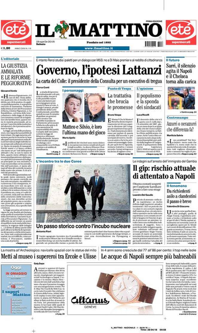 Il Mattino – Come sempre dominano la prima pagina del giornale napoletano diverse news di politica e cronaca sia italiana che estera. Si parla del Napoli in un trafiletto a lato, con il Chelsea che starebbe sondando Maurizio Sarri. Il quale ora fa preoccupare non poco riguardo ad un rinnovo che non arriva ancora.