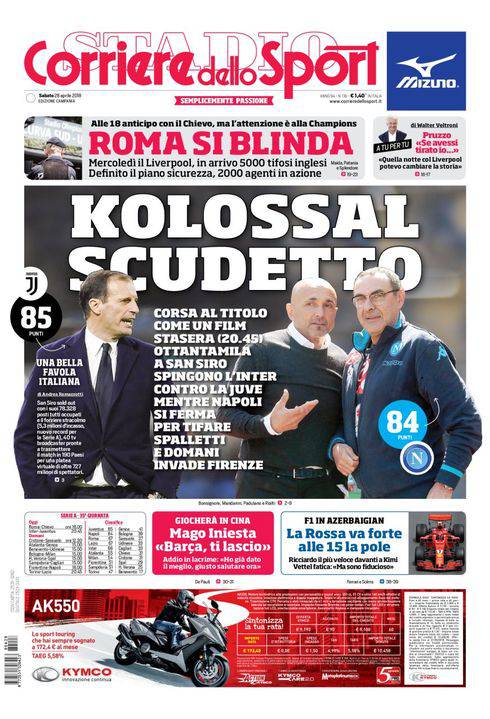 Il Corriere dello Sport – Il giornale romano parla di “Kolossal Scudetto”. Parte il rush finale che nel giro di un mese assegnerà il tricolore ad una tra Napoli e Juventus. Bianconeri impegnati questa sera in casa dell’Inter, azzurri che affronteranno la Fiorentina domani in Toscana. In alto “Roma si blinda”, in occasione del ritorno delle semifinali di Champions League contro il Liverpool. Le intemperanze dei tifosi giallorossi all’andata condizioneranno purtroppo il match. Attesi 5000 supporters inglesi, saranno 2000 gli agenti schierati. In basso altre di calcio e vari sport.