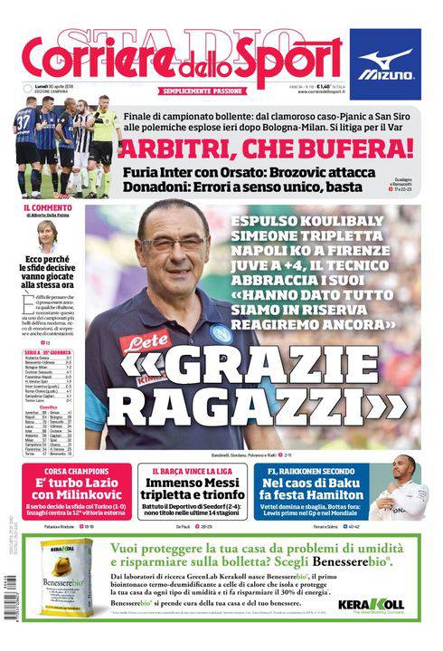 Corriere dello Sport – Il titolo dell’edizione campana del quotidiano romano è esemplificativo. “Grazie Ragazzi”. La sconfitta di Firenze per 3-0, condizionata dall’immediata espulsione di Koulibaly, sembra proprio essere il sipario che chiude i giochi per lo scudetto, a tre giornate dalla fine. Il campionato del Napoli è stato comunque grandioso, e Sarri ora si dice concentrato sul record di punti, pur ammettendo i limiti della squadra ieri al ‘Franchi’. Questo turno intanto si è contraddistinto per le sviste arbitrali che hanno generato polemiche feroci. Atesso per oggi un dossier dell’Inter contro Orsato. In basso altre di calcio e vari sport.