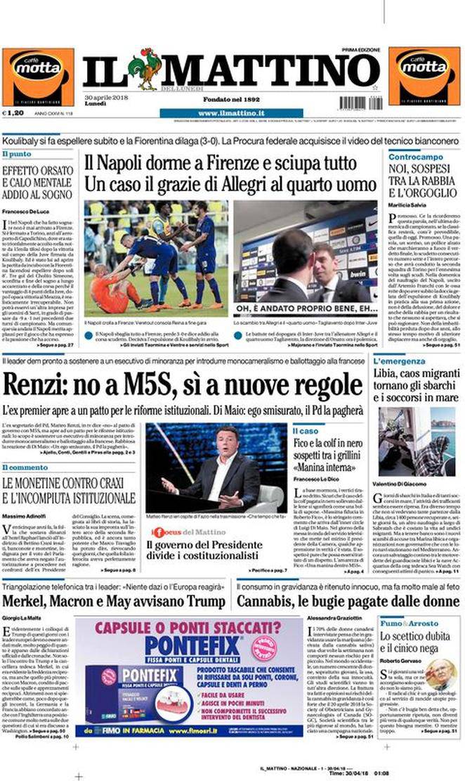 Il Mattino – Il giornale napoletano parla di un “Napoli che dorme a Firenze e sciupa tutto”. Ma pone l’accento anche su un filmato che ritrae Allegri ringraziare Paolo Tagliavento, quarto uomo in Inter-Juve di sabato. Per il resto la prima pagina è contraddistinta da altre notizie di cronaca e politica italiana.