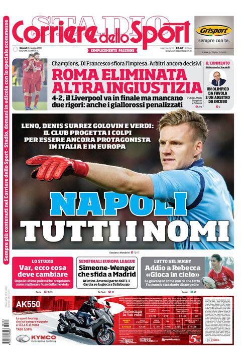 IL CORRIERE DELLO SPORT – Il quotidiano romano apre con in prima pagina il ‘casting’ Napoli. Sono diversi i nomi ai quali la società azzurra starebbe pensando per rinforzarsi in vista della prossima stagione. Per la porta si parla molto del portoghese Rui Patricio dello Sporting Lisbona, ma non tramonta la pista Leno. Altri giocatori accostati alla squadra sono Denis Suarez del Barcellona, il bolognese Verdi e Golovin, 21enne centrocampista del CSKA Mosca e della nazionale russa. In alto, Roma eliminata dal Liverpool nonostante la vittoria per 4-2, in finale di Champions League ci vanno gli inglesi, ma Dzeko e compagni sono in credito di due rigori. In basso speciale su come migliorare il Var, poi la semifinale di ritorno di Europa League, Atletico Madrid-Arsenal. Infine tragedia nel rugby con la morte di una 18enne dopo un colpo al capo preso in una partita.